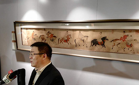 《五王醉歸圖卷》在拍場展出。中新網(wǎng)記者 宋宇晟 攝 保利拍賣執(zhí)行董事趙旭在接受采訪時介紹稱:“任仁發(fā)是記錄在《二十四史》中的畫家,在元代相當于是水利部部長。乾隆皇帝收藏了任仁發(fā)9件作品,其中有8件在博物館。因此這件作品本身就非常罕見。” 他直言,該作品成交價的確“超出預期”?!敖?0位買家參與競拍,最終成交價創(chuàng)今年中國藝術(shù)品在全球的最高成交紀錄。”(完) (記者 宋宇晟) |